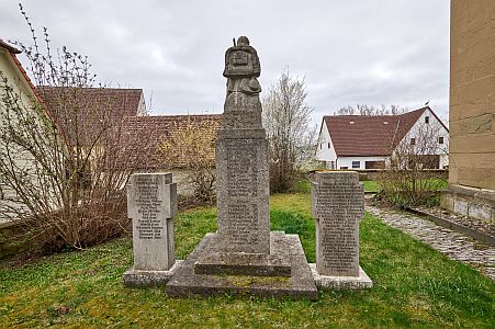 Steinsäule mit einem darauf knienden Soldaten. Daneben zwei Gedenksteine in Kreuzform.
