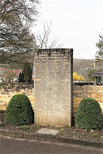 Steinerne Gedenktafel am Eingang des Tischardter Friedhofes mit Namen und Todesjahr der Gefallenen beider Weltkriege.