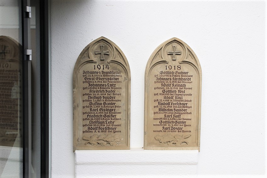 Zwei Gedenktafeln Erster Weltkrieg an der Abdankungshalle mit genauem Todesdatum und -ort.