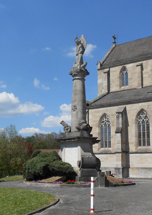 Kirchenvorplatz: Quadratischer Sockel mit Steintafeln und den Namen des Ersten Weltkriegs,
