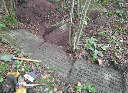 Massengrabs sind versetzt und teils im Boden versunken. Eine Platte ist fast ganz verschwunden.