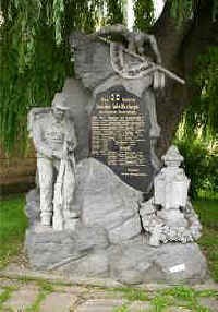 Neben der St. Peter-Kirche Mahnmal aus Stein mit Soldaten und Adler, mit Gedenktafel.