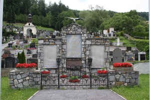 Vor dem Friedhof Mauer mit drei eingelegten Gedenktafeln, mittlerer Teil erhöht, oben mit Adler.