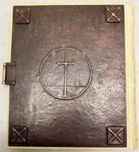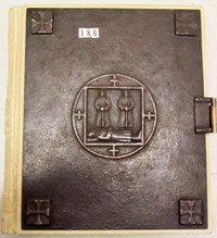 enthüllt. Das Buch hat einen schweren Umschlag-Einband aus Bronze, mit bildhaften Darstellungen auf Vorder- und Rückseite. Im inneren Teil befinden