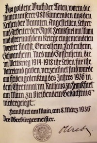 Das goldene Buch der Toten, worin die Namen unserer 980 Kameraden aus den Reihen der Beamten, Angestellten, Lehrer und Arbeiter der Stadt Frankfurt a. M. und ihren nach dem Krieg eingemeindeten Vororte Höchst, Griesheim, Fechenheim, Schwanheim, Nied und Sossenheim, die im Weltkriege 1914-1918 ihr Leben für ihr Vaterland gaben, verzeichnet sind, wurde am Heldengedenktag des Jahres 1936 in dem Ehrenmal im Rathaus zu Frankfurt a. M. zu bleibenden Gedächtnis niedergelegt.