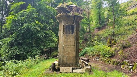 Schwer beschädigte Stele für den Ersten Weltkrieg oberhalb des Ortes.