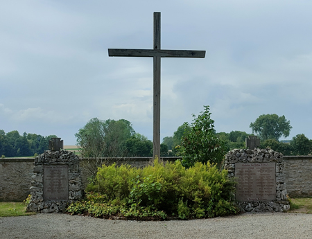 Ein großes christliches Kreuz steht zwischen den Steinen mit den Gedenktafeln beider Weltkriege.
