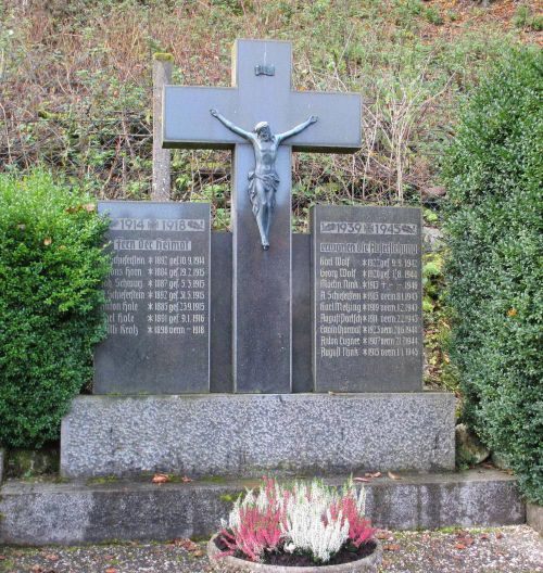 Steinkreuz, daneben zwei Gedenkplatten