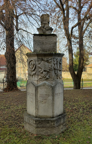 Denkmal mit krönendem Tatzenkreuz für den 1. Weltkrieg vor der Kirche St. Nikolaus.