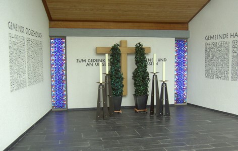 In der Aussegnungshalle des Friedhofs an der linken Wand Tafel mit den Namen beider Weltkriege der Gemeinde Großschönach,