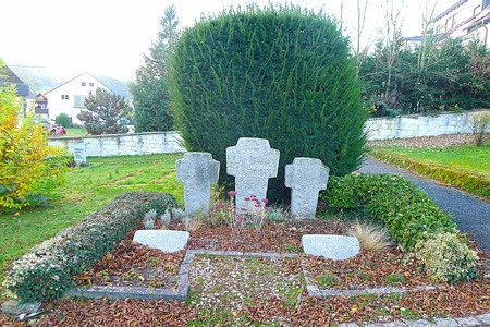Die hufeisenförmig angelegte Kriegsgräberstätte (Sammelgrab für sechs Tote) besteht aus drei Steinkreuzen,