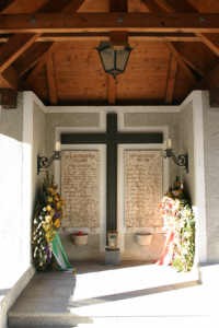 Im überdachten Anbau der Kirche in der Mitte Metallkreuz, daneben Gedenktafeln.