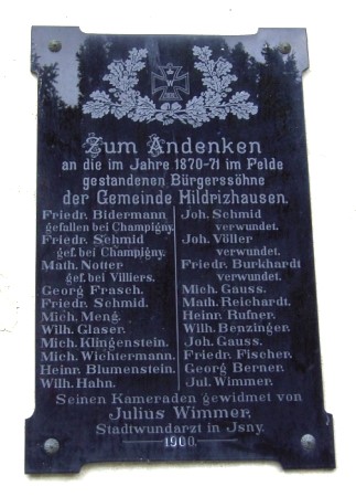 Kirche mit altem Friedhof. An der Kirche außen eine Tafel mit den Namen von 1870/71.