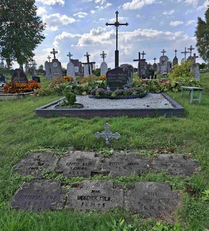 des Dorfes. Sieben übrig gebliebene Grabplatten wurden vor einem kleinen Metallkreuz zusammengelegt.
