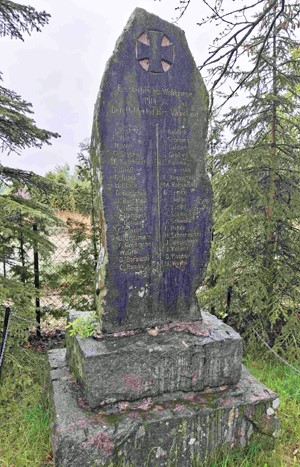 Zweistufiger Sockel aus Natursteinen mit aufgesetztem schmalem Felsblock.