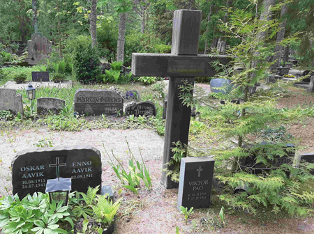 Fünf Opfer haben einen gemeinsamen Grabstein mit schwedischer Widmung: „de blev offer för runös sak