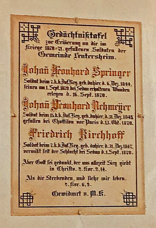 | Soldat | SPRINGER | Johann Leonhard | 06.12.1844 | 16.09.1870 | 7. k.b. Inf. Reg. | Soldat beim …, geb. dahier d. …, seinen am 1. Sept. 1870 b. Sedan erhaltenen Wunden erlegen d. … |