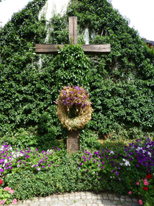 Ein Holzkreuz vor der Kirche erinnert an die Gefallenen und Vermißten.