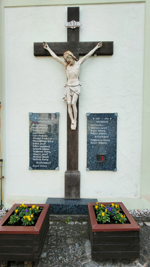 Gedenktafeln zu beiden Seiten des Gekreuzigten an der Kirche für Medbach und Kieferndorf.