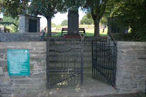 Kriegerdenkmal auf dem Friedhof. In der Mitte ein Gedenkstein, zu beiden Seiten zwei,