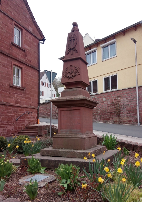 Obelisk auf hohem Sockel. Den oberen Abschluss des Obelisken bildet ein bayerischer Infanteriehelm. Auf der Vorderseite befinden sich
