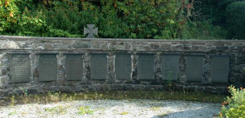 Steinwand mit Deutschem Kreuz. An der Wand sind Gedenktafeln angebracht.