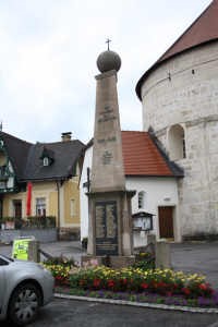 Bei der Kirche dreieckige Säule, oben mit Kugel und Kreuz, Gedenktafeln und Inschriften an allen Seiten.