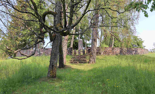 Auf einer Erhöhung befindet sich eine kreisförmige und dick ummauerte Anlage aus Natursteinen.