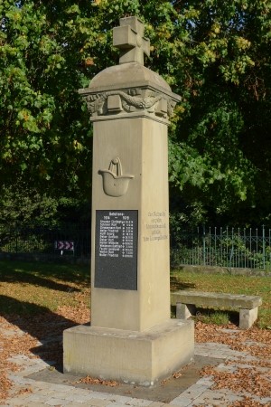 Vierseitige Gedenksäule aus regionalem Lettenkeuperfeinsandstein, zuoberst mit steinernem Tatzenkreuz,