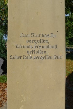 beider Weltkriege sowie ergänzende Datums- bzw. Jahresangaben sind auf zwei gegenüber liegenden Seiten der Gedenksäule angebracht.