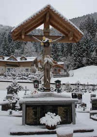Im Friedhof: Denkmal vorne mit Gedenktafel, darüber überdachtes Holzkreuz mit Heiland.