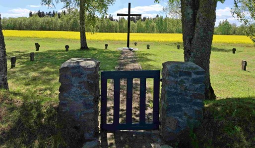 und Birken an einem Feldweg. Eine Eingangspforte mit Pfeilern führt zu einem Hochkreuz aus Holz.
