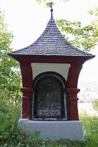 Gedenktafel an einem Bildstock (Kreuzweg) zwischen Parkplatz und Wallfahrtskirche.