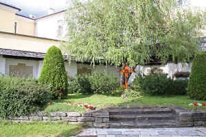 Bei der Kirche Gedenktafeln in Nischen der ehemaligen Friedhofsmauer, davor vor einer Trauerweide überdachtes Holzkreuz.