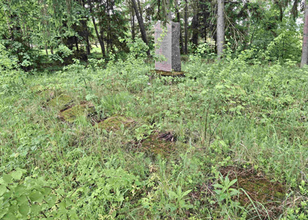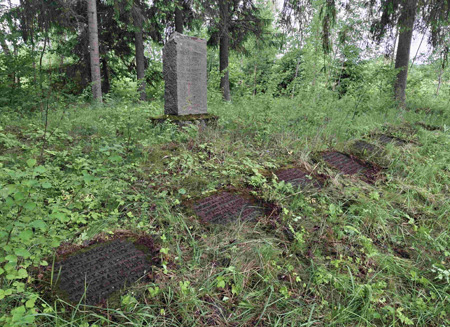 liegen acht flache Namensplatten. Der Friedhof ist verwildert und die Namensplatten dick mit Moos belegt.