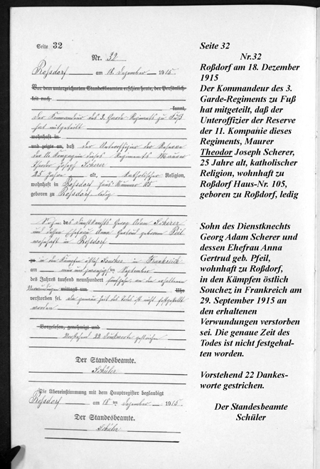 | Unteroffizier | SCHERER | Theodor Joseph | Roßdorf | 29.09.1915 östlich Souchez | 3. Garde-Regiment zu Fuß, 11.Komp. | 25 Jahre, Maurer, ledig, an Verwundung gestorben |