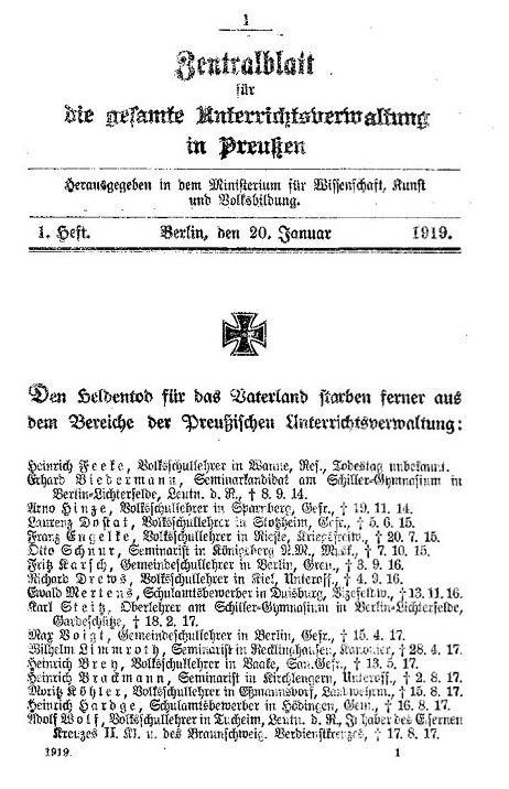 Den Heldentod für das Vaterland starben aus dem Bereich der Preußischen Unterrichtsverwaltung: