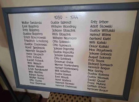 Die Gedenktafel des 2. Weltkriegs war im Jahre 2025 nicht mehr aufgehängt, neu und schlichter gerahmt und auf einem Stuhl abgestellt.