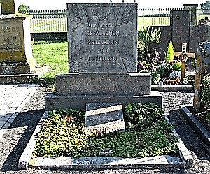 Den Grabstein ziert ein großes Eisernes Kreuz mit einer Gedenkinschrift und Lorbeerzweigen sowie Eichenzweige.