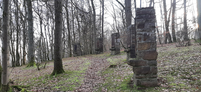 Zentraler Bestandteil ist der mächtige Stelenkranz aus neun Bruchsteinsäulen mit der markanten Inschrift "Unsern Helden". Sie