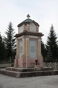 Italienischer Teil des Soldatenfriedhofes (Grabfeld H), auf einem 2-stufigem Podest stehendes Denkmal, Inschriften an allen Seiten, Grabkreuze aus Beton.
