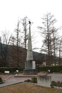 die Namenstafeln sind sternförmig um die Säule angeordnet, alles in kyrillischer Schrift (92 Namen alle 2. Weltkrieg).