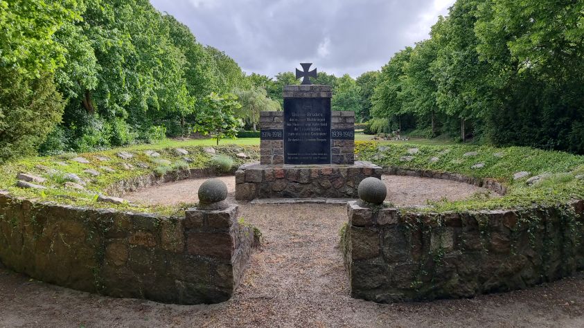 Ehrenmal für die Gefallenen beider Weltkriege. Rondell mit Denkmal in der Mitte, am Rand Steine mit den Namen der Gefallenen.