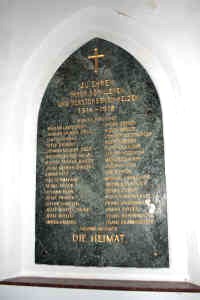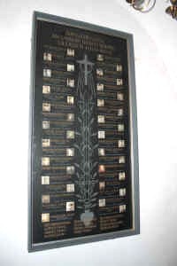 Im Eingangsbereich der Kirche zwei Gedenktafeln, eine davon mit Fotos.