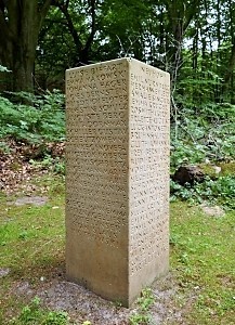 Am linken Rand des Friedhofs eine Stele mit Namen unter anderem aus Neuhof und dem Umsiedlerlager Dwasieden.