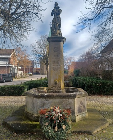 Freistehender Brunnen an dessen Seiten Namenstafeln angebracht sind.