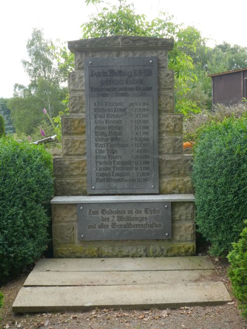 Wand aus bearbeiteten Natursteinen, darin eine Inschriften- und eine Gedenkplatte
