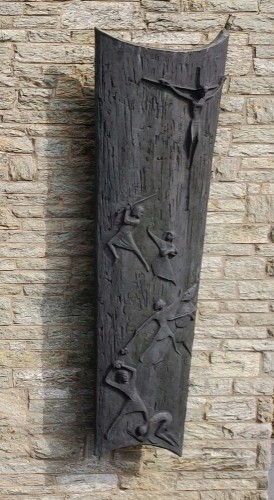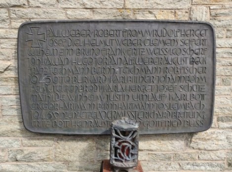 Gemauerte Wand auf dem Friedhof, darauf angebracht drei Bronzeplatten mit Eisernem Kreuz,