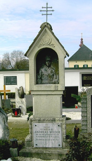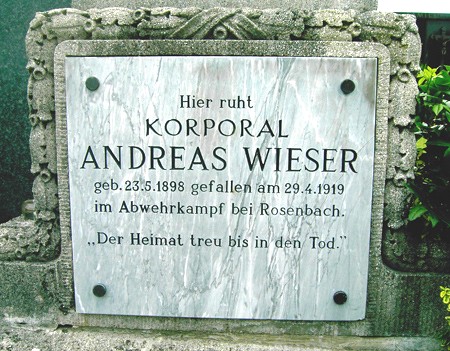 Hier ruht KORPORAL ANDREAS WIESER geb.23.5.1898 gefallen am 29.4.1919 bei Rosenbach. „Der Heimat treu bis in den Tod“
