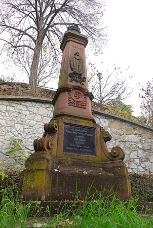 Vierseitig beschriftetes Säulenmonument aus Buntsandstein zum Gedenken an die Königsbacher Soldaten